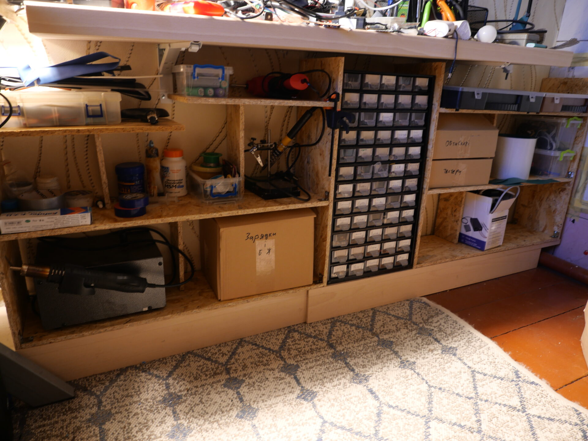 На другому інші прилади типу точкового зварювального апарата, різноманітні конектори і інструмент. Після того як зробив полички лишилось ще й вільне місце. Особливо їх якось не оздоблював, бо..”немає нічого більш постійного, ніж щось тимчасове”. Я задоволений.