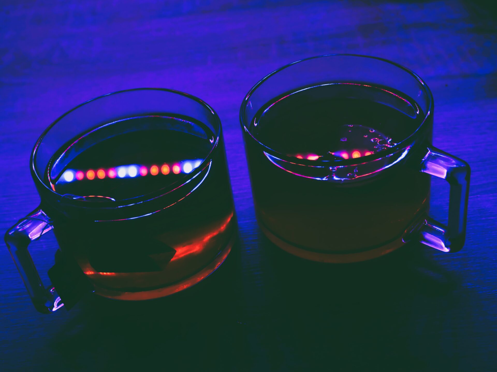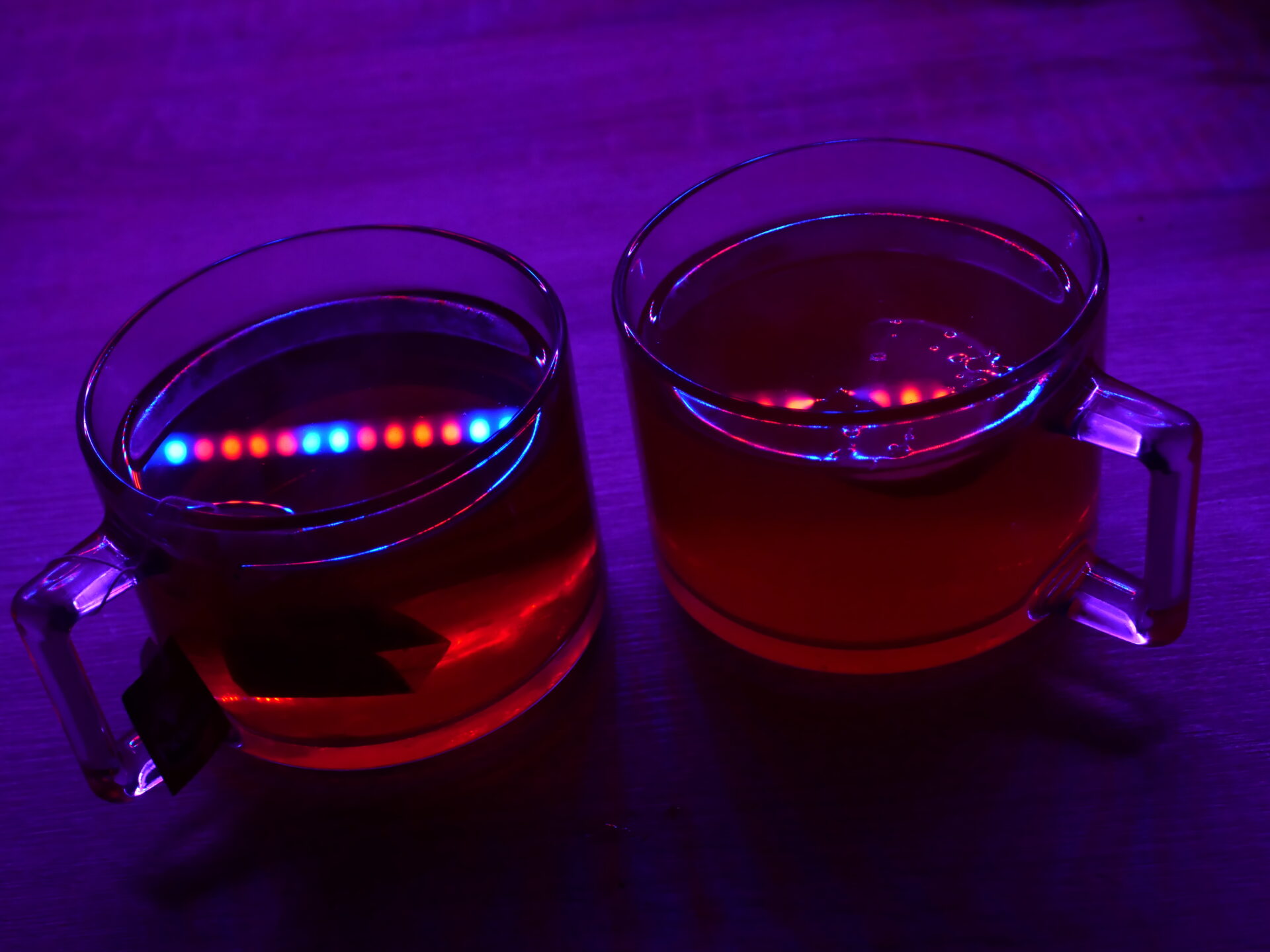 Чашки підсвічені світлодіодною підсвіткою для квітів, яка зараз використовується не для них, а просто як вечірнє світло на кухні. Кухня в неонових тонах виглядає незвично, але цікаво. Рекомендую.