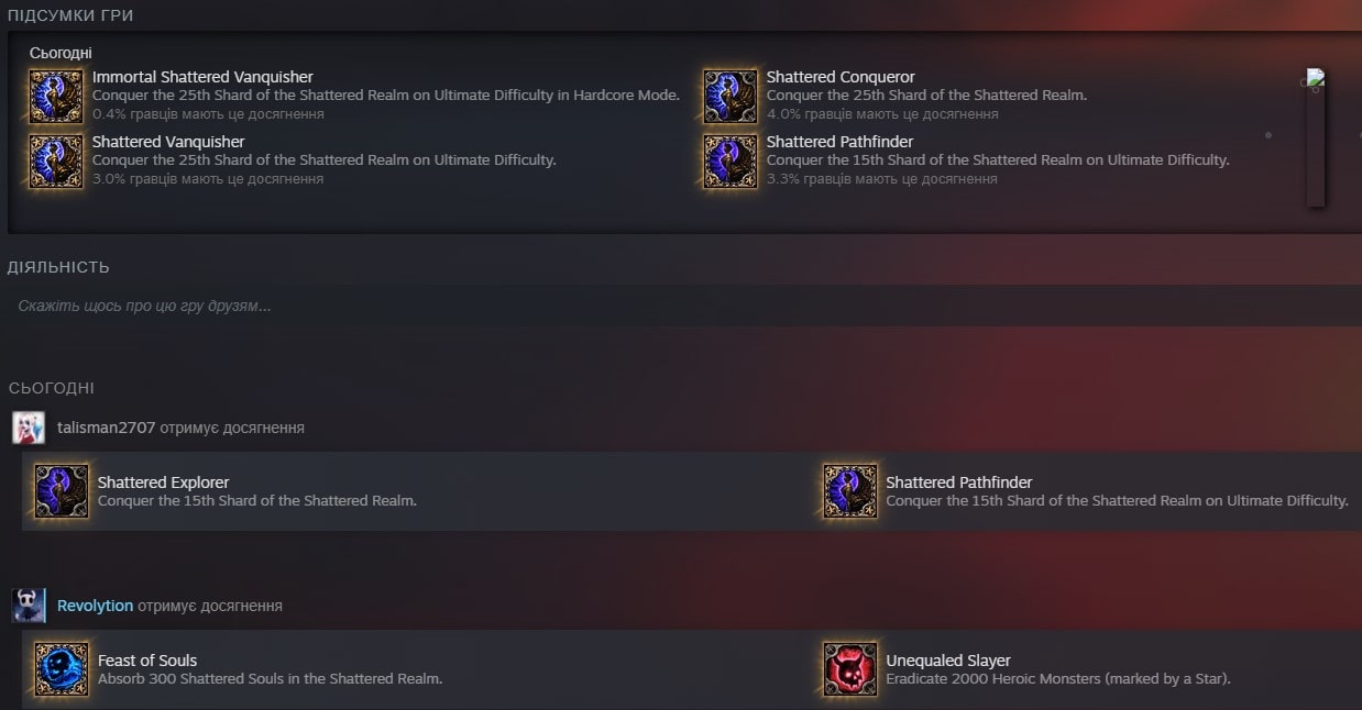 У нас сімейне синхронне отримання найважчих досягнень у грі. Щоб його отримати (загалом, те що саме першеньке), було потрібно три рази пройти гру на різних рівнях важкості (одне проходження це близько 3 вечорів), потім ще пройти два доповнення. Це все за умови, що кожен з наших персонажів не мав вмерти протягом цього всього шляху. Якщо вірити статистиці, кожен з персонажів прожив…п’ять днів реального часу. Тобто, клятих 100+ годин. Чи воно того було варте? Авжеж! Бо ж ідея була пройти то разом. Тож…ай, вам все одно не зрозуміти 😀