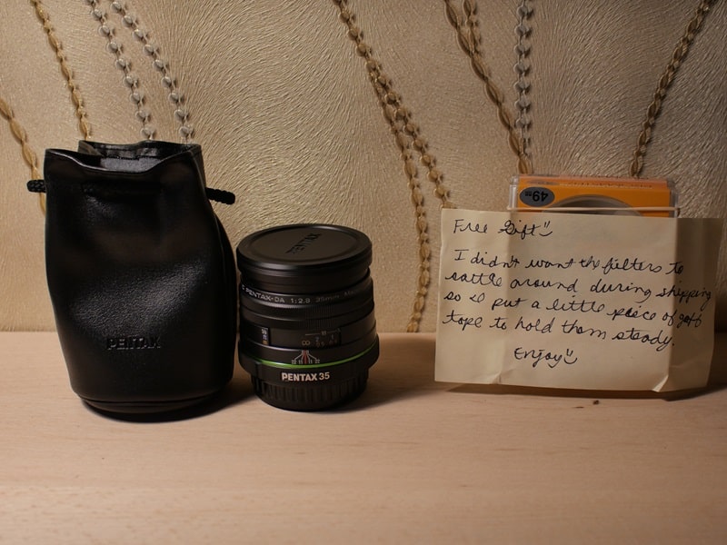І от, сьогодні забрав посилку, розпакував, і знайшов там цікаву записку. Чоловік вирішив зробити маленьку приємність, додав “little piece of gold” – два полярізаційні фільтри. На Амазоні один такий коштує 40 доларів (об’єктив коштував 110).